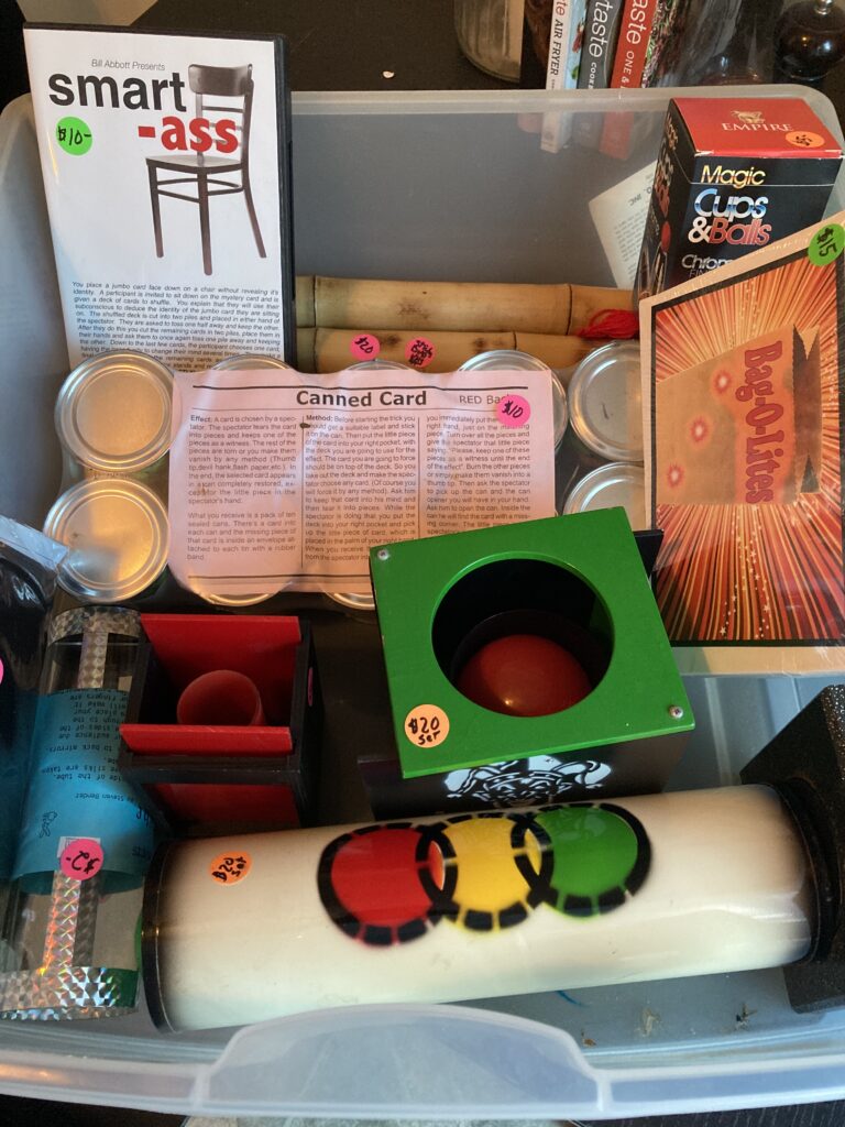 Over the weekend my buddy Mike Dobias hosted a magic garage sale! Mike had bought out the inventory of Mickey Hades magic shop in the 1990’s and wanted to get what was left of it out of his garage. He also had some of his old personal props from his shows and let me bring a couple of boxes of stuff.