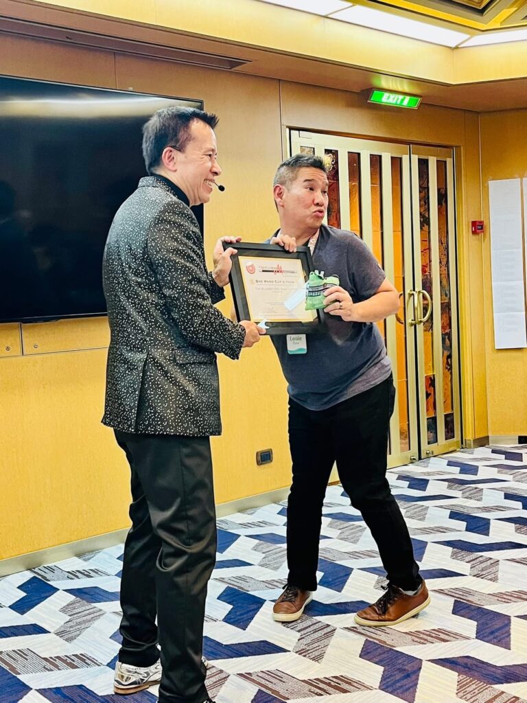 The final day at the Pacific Coast Association of Magicians (PCAM) convention was a show day for me. I skipped the card clinic in the morning to prep my show for the afternoon. Here’s what I look like before showtime (I’ll add the after later in this post)!