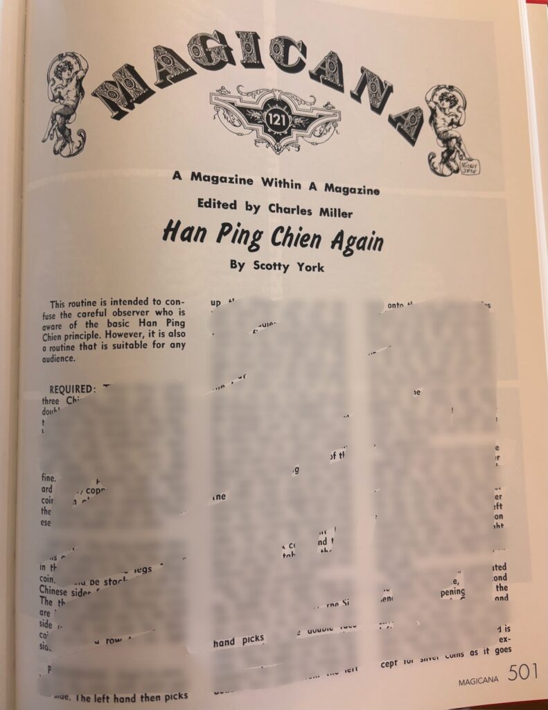 I did a little hunting around and found the Hang Ping Chien article that’s mentioned in the postcard. It’s from the April 1975 Genii magazine or page 501 in the Magicana book.
